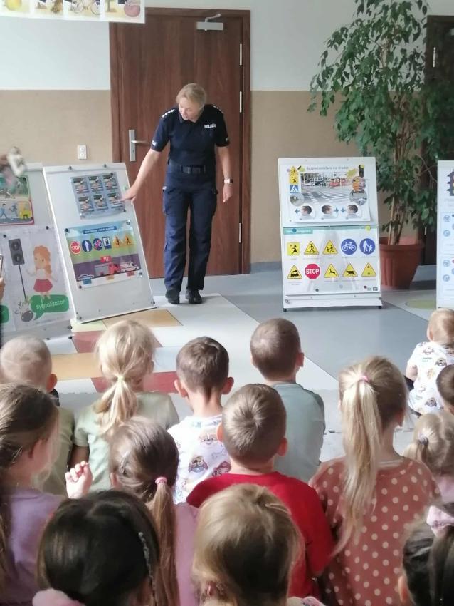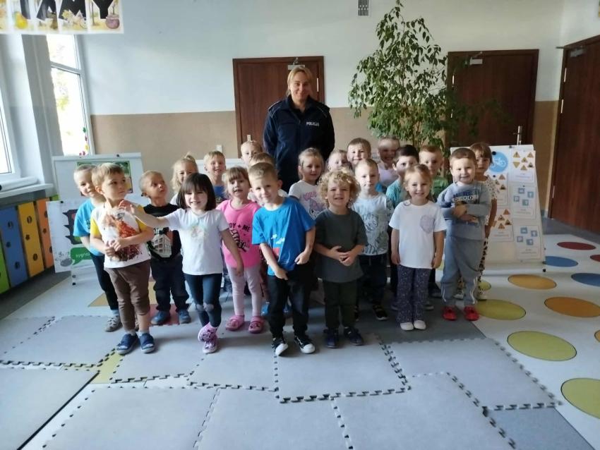 Przedszkolaki czynnie uczestniczyły w spotkaniu, zadawały pytania, brały udział w zabawach ruchowych, rozwiązywały zagadki słuchowe i słowne, zaśpiewały piosenkę, a na koniec pozowały do zdjęcia z Panią Policjant.