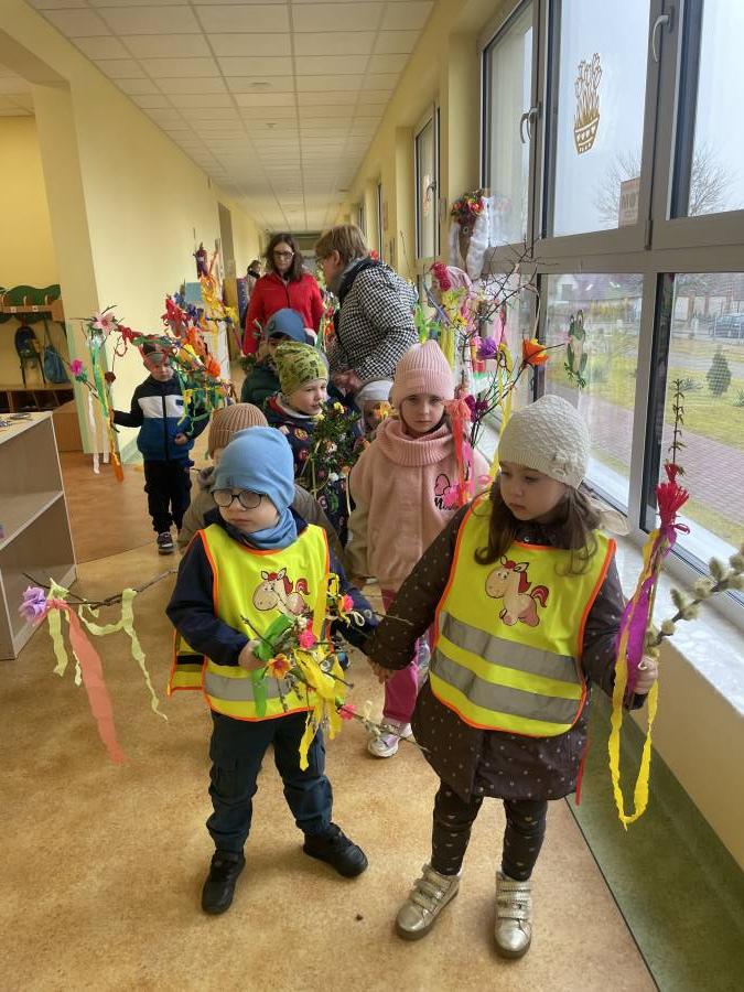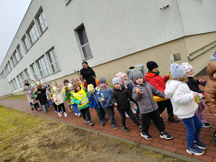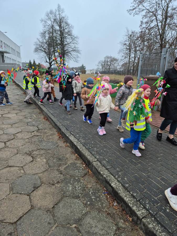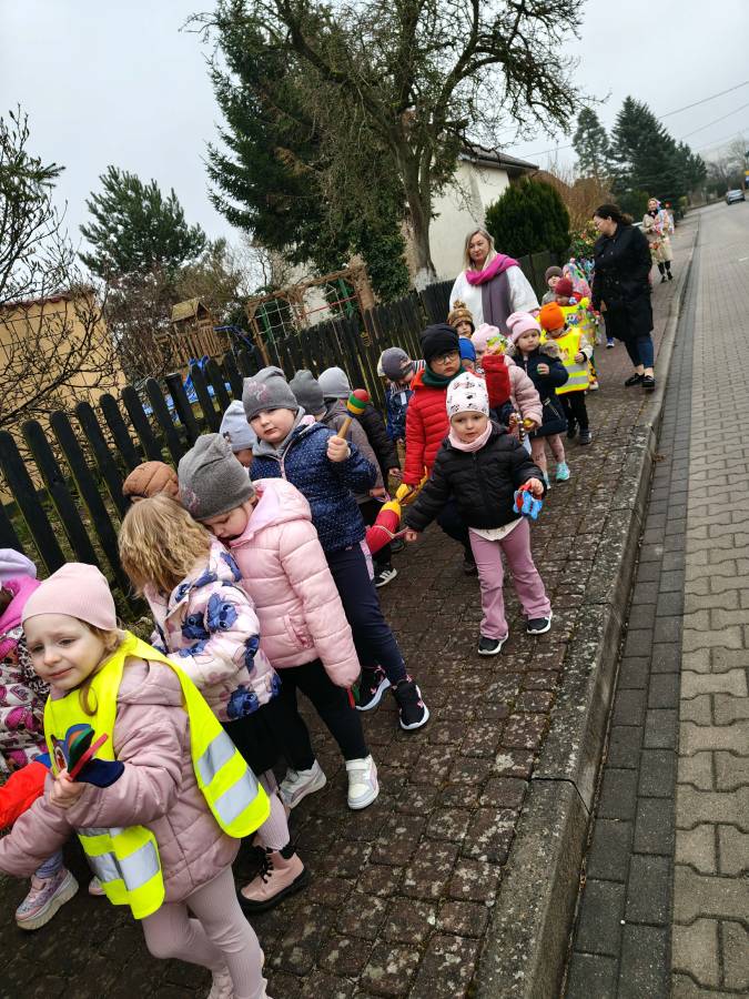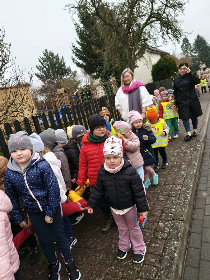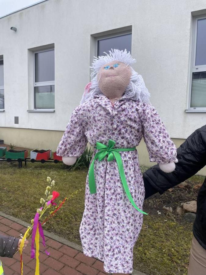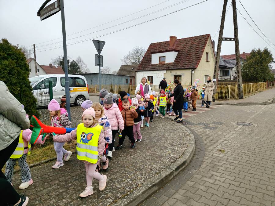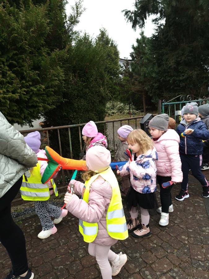 Młodsze grupy, "Krasnale", "Smerfy" i "Motylki" wybrały się na marsz wiosenny w towarzystwie naszej przedszkolnej Pani Zimy, zostawiając ją w połowie trasy na zaprzyjaźnionym płocie :). Dzieci w serdeczny sposób pomachały Pani Zimie na pożegnanie. Z pięknymi kolorowymi gałązkami w rękach, w akompaniamencie instrumentów wróciliśmy wszyscy do Przedszkola we wspaniałych humorach, z nadzieją na ciepłe dni i zajęcia na świeżym powietrzu.
